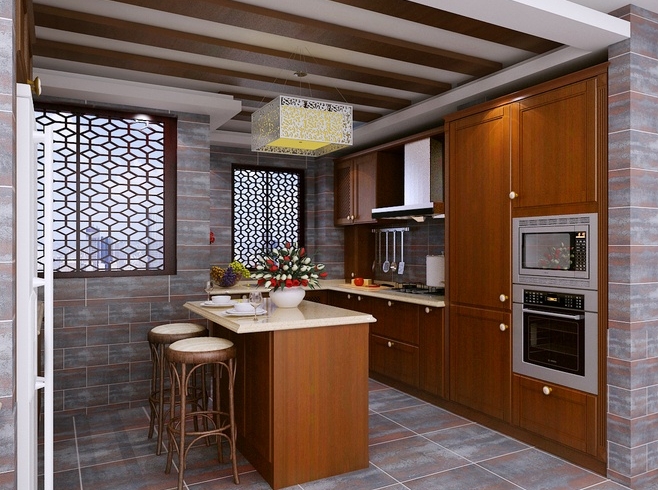 廚房的臺面設(shè)計也要以方便為原則。一些中式別墅的廚房臺面現(xiàn)在也大多采用大理石,既防潮又方便清潔,顏色以黑白為主,配合木色的櫥柜。廚房臺面的高度和寬度依據(jù)人體工程學標準而定,以方便使用。此外由于別墅廚房面積較大,可以在別墅廚房裝修時,在臺面上進行階梯式設(shè)計,放置一些調(diào)味盒、刀叉用品等。