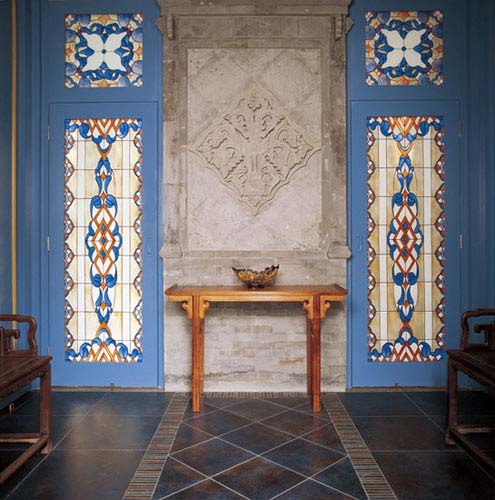 門廳工整考究,打開大門,迎面是傳統的灰磚與玲瓏剔透的玻璃磚形成的玄關。