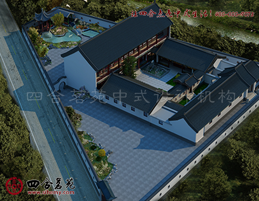 粉墻黛瓦、屋舍錯落,漏窗、月洞門,尺樹寸泓。掇山理水,色彩與園林景觀上給人江南園色的印象,而房屋對稱圍合,比例、尺寸也顯著四合院的布局。