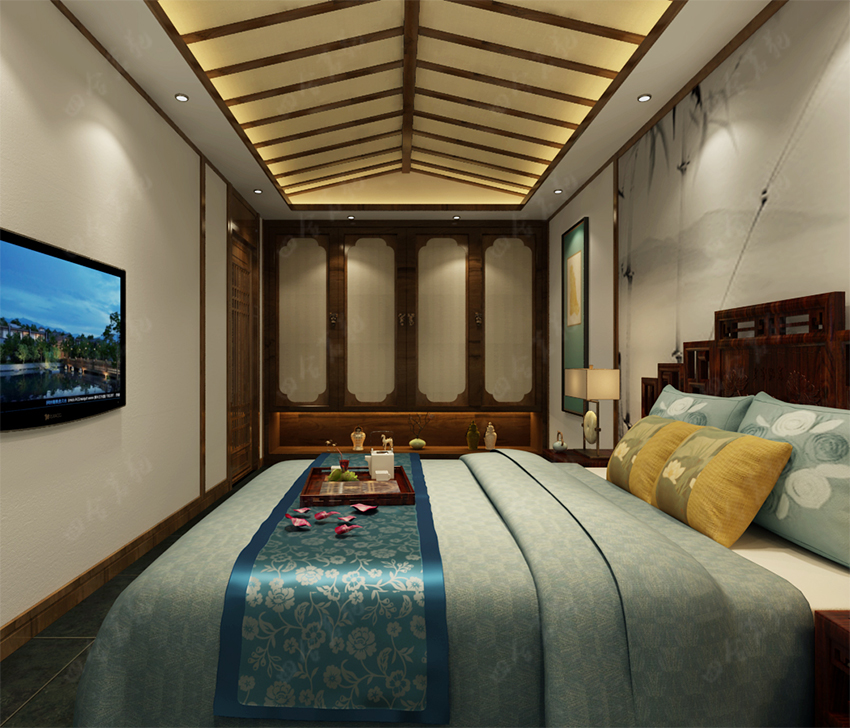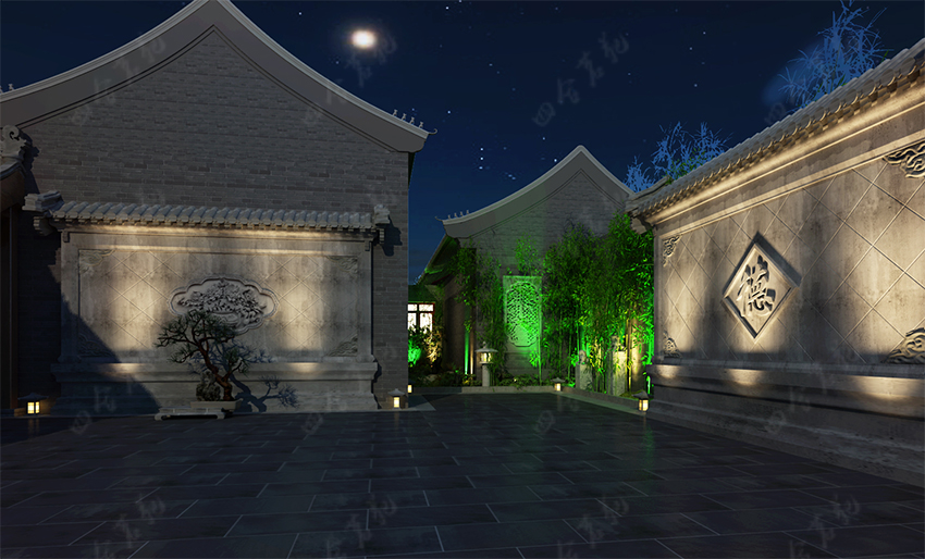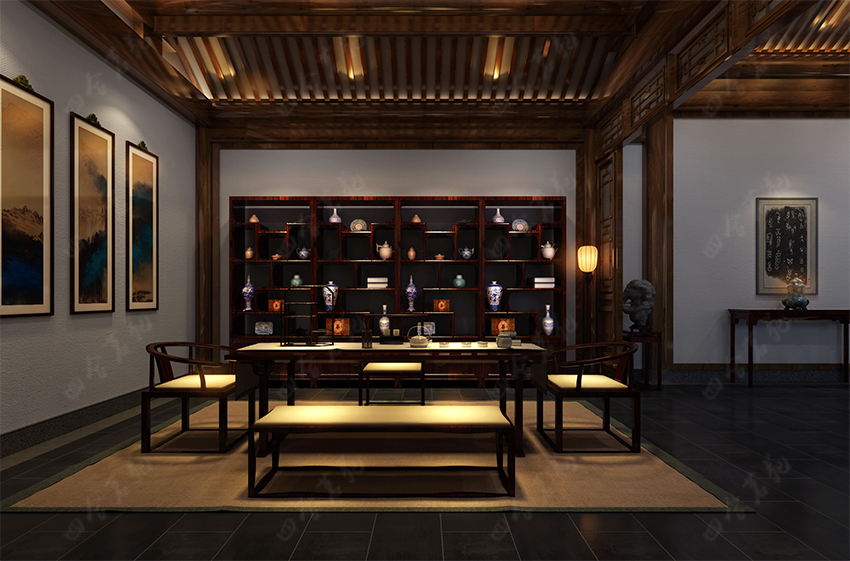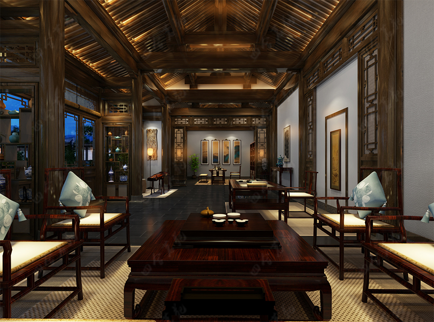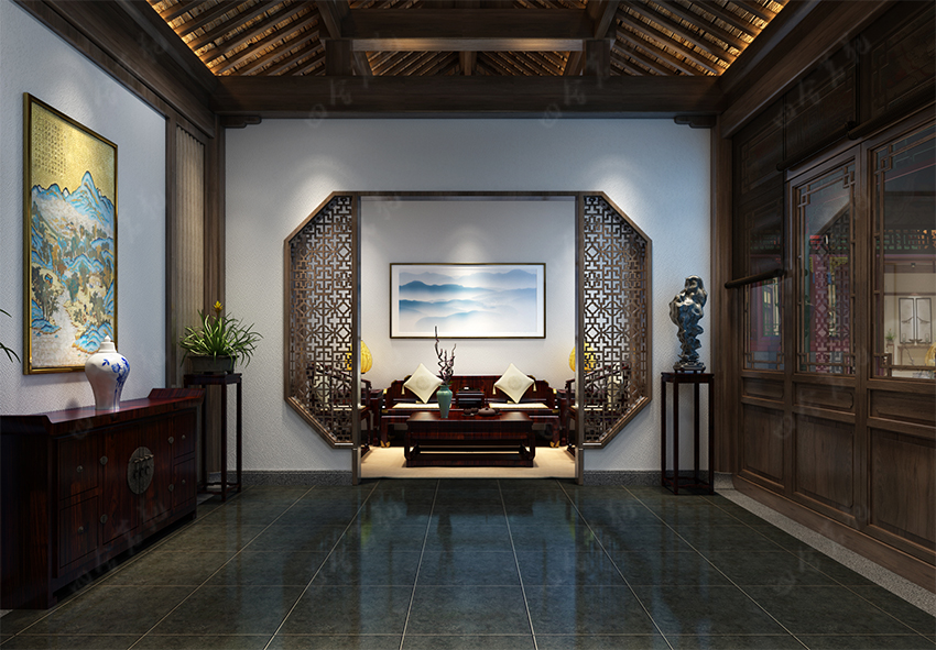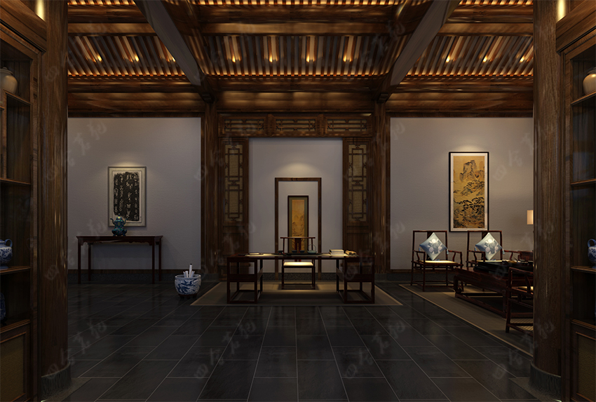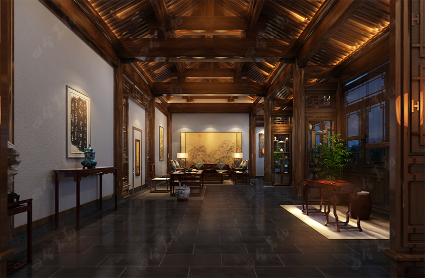 四合院設(shè)計(jì)崇尚自然情趣,不用過多的色彩裝飾,以免打破了優(yōu)雅的情調(diào)。色彩以沉穩(wěn)的深色系為主,家具大面積使用原木色,局部運(yùn)用暖黃燈光的鋪排,這樣整個空間的色彩得到良好的協(xié)調(diào)統(tǒng)一。