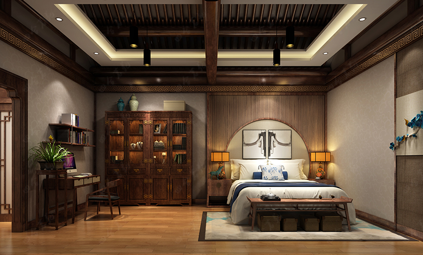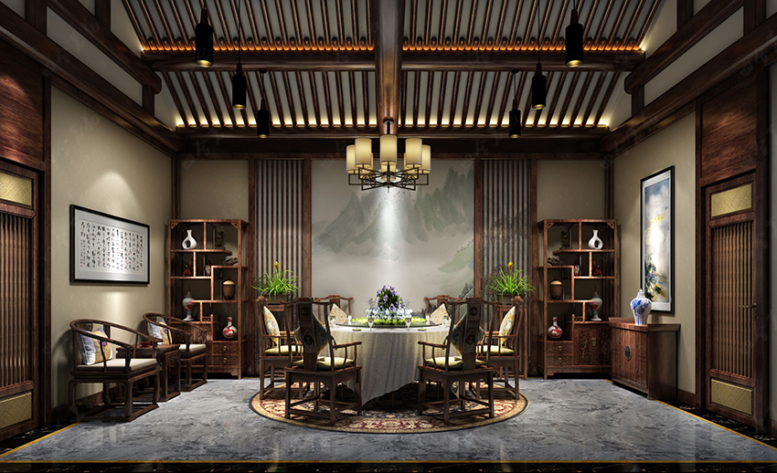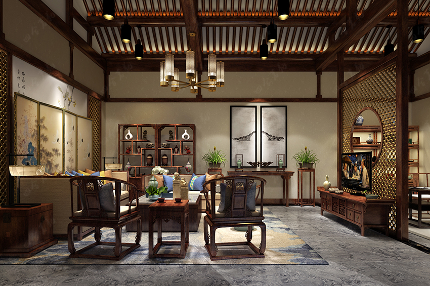 追尋往昔,我們不難發(fā)現,真正的生活應該和植物、山水、平和、文化結合在一起。設計師將這些概念寫入眾多裝飾元素:盆景、隔扇、山水畫、梁架、博古架、青瓷古玩,通過充滿匠心的布置合而為一,帶給人一種自然親切、古韻盎然的愜意體驗。