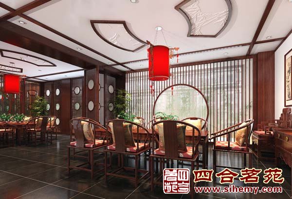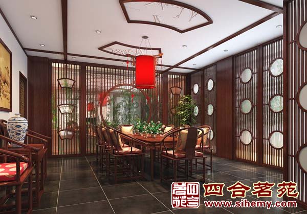 雅間二:雅間靠窗的花格可從月門出,將后面窗戶開啟。當微風輕拂,透過白沙,竹影朦朧飄渺,好像賦予了天棚上雕刻竹簡生命,回味無窮。房間整體設(shè)計,采用園林式借景為背景,意境深遠,淡定,輕松。